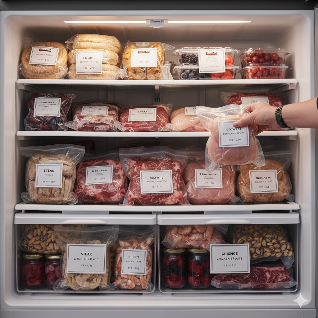 • 정육/수산: 1회 조리 분량으로 즉시 소분, 공기 차단, 라벨링(부위/용도/날짜)